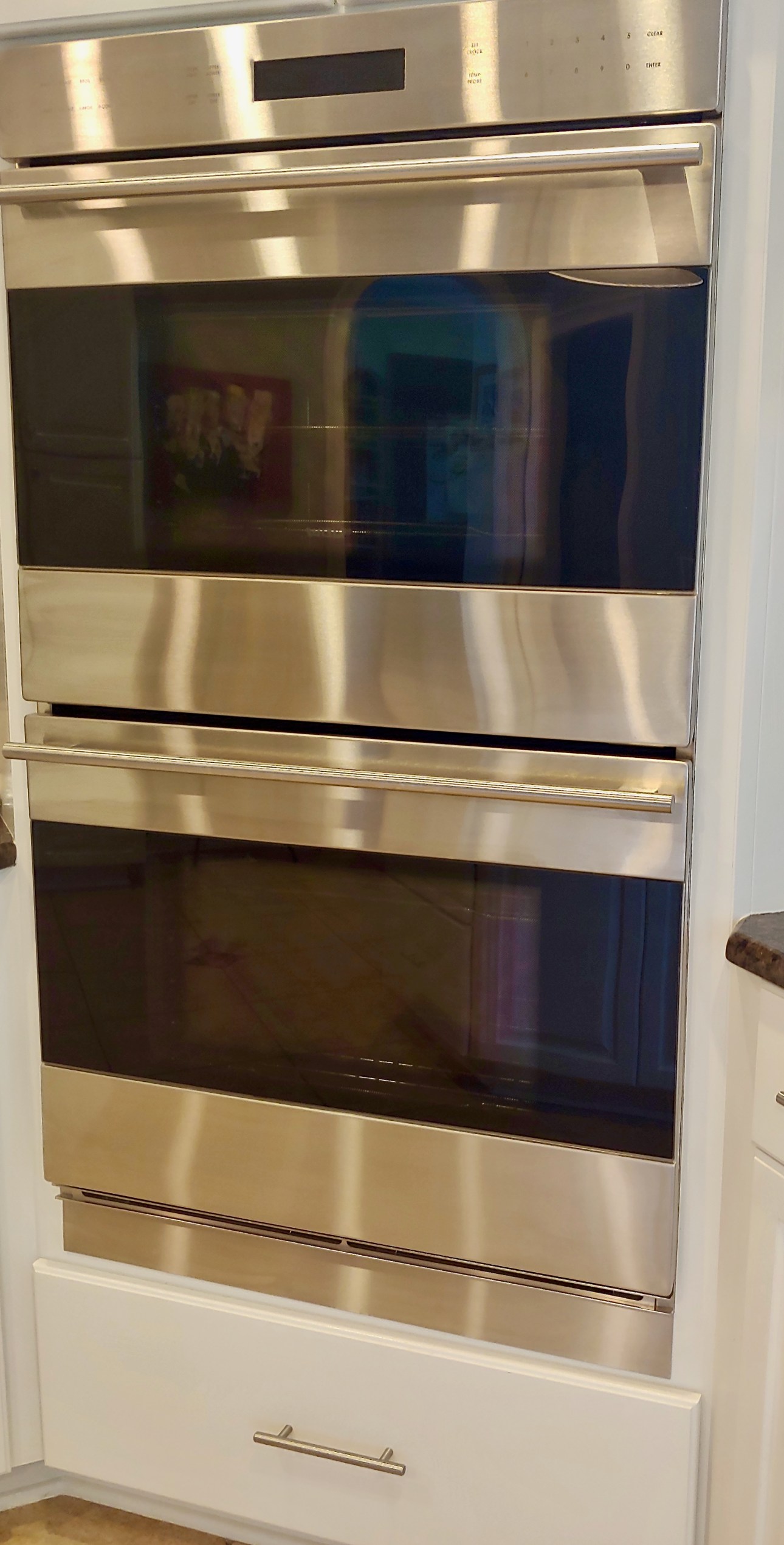The big-ticket item of the kitchen facelift was the replacement built-in oven. Of course, I chose a Wolf oven that didn’t fit the current cut-out space in the cabinetry. However, a whole kitchen remodel wasn’t something that I had planned, and the cost was going to be prohibitive. With the help of a capable professional, the existing cabinetry remained, and a strategic piece of custom-cut stainless steel covered the gap under the new oven.